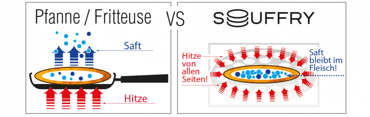 Durch die neuartige Hitzeverteilung für Schnitzel haben wir festgestellt, dass Souffry Schnitzel durch den „Schock-Hitze-Effekt“ viel saftiger bleiben und das auch über längere Zeit hinweg.